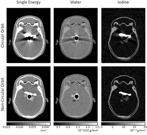 A simulation of head phantoms with metal implants, simulated bleeds, and simulated regions of extravasation was performed and imaged using single energy techniques versus spectral techniques and non-circular orbits versus circular orbits. The combined sinusoidal orbit and spectral technique allowed images with reduced metal artifacts and clear differentiation between the bleed zones and extravasation. Compared with the circular orbit images, there is a clear presence of metal artifacts, and the single energy method (traditional CT) is unable to differentiate between the two materials. The figure above shows the comparison of reconstruction results from circular and non-circular orbits using single energy and spectral measurements.