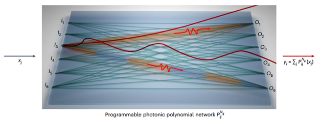 The inventors created a programmable photonic chip using a special semiconductor material called InGaAsP, which can absorb or amplify light. By shining a second light (the pump), they control how this material responds to a signal light passing through. This enables the implementation of programmable nonlinear functions—such as high-order polynomials—directly on-chip. These nonlinear transformations form reconfigurable connections between input and output ports, creating a photonic polynomial network. The architecture supports fast, energy-efficient data processing and in situ training, making it well-suited for artificial intelligence and other optical computing applications.