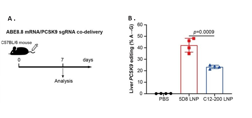 LNP-mediated in vivo gene editing using adenine base editing (ABE). (a,b) LNPs encapsulating ABE8.8 mRNA/PCSK9 sgRNA were i.v. injected into C57BL/6 mice at a total RNA dose of 0.75 mg/kg. On day 7, DNA was extracted from the liver to determine on-target indel frequency by next-generation sequencing, yielding ~40% 5D8 LNP editing efficiency versus ~20% editing efficiency with standard-of-practice C12-200 LNP.
